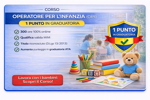 Il corso è finalizzato alla formazione della figura dell’Operatore per l’Infanzia, fornendo competenze educative, relazionali e assistenziali per lavorare con bambini e minori. L’obiettivo è preparare professionisti in grado di supportare lo sviluppo educativo e sociale del bambino, oltre a migliorare il punteggio nelle graduatorie ATA.